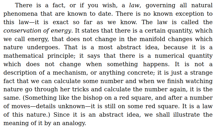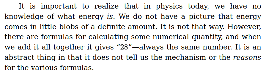 Ma cosa'è l'energia? → Concetto legato alla sua conservazione — Definizione in Wikipedia inglese (si stressa la sua proprietà di esser traferita senza scomparire) — Definizione in Wikipedia italiana (legata alla "capacità di compiere lavoro":(*) → uhm... pessima) — [idem su Treccani e libri di testi,(**) almeno per quanto riguarda la definizione] — Un articolo abbasta recente sulla questione (più o meno ok) — Interessante la voce di Wikipedia francese e la citazione di Max Plank riportata — in fondo alla parte storica (e l'articolo richiamato nella nota 48 — sito visitato 10/04/2024): — "Tratterò del concetto di energia solo nella misura in cui può essere attaccato al principio — che dà il titolo a questo saggio, supponendo che il concetto di energia in fisica — tragga il suo significato soprattutto dal principio di conservazione che la riguarda" [→ Feynman] —(Das Prinzip der Erhaltung der Energie, 1887) — Interessanti slides sul tema |