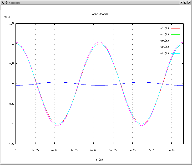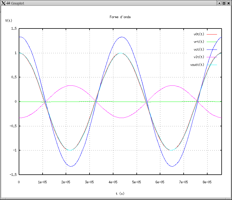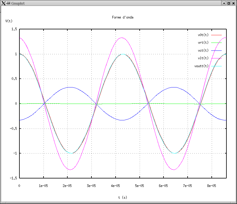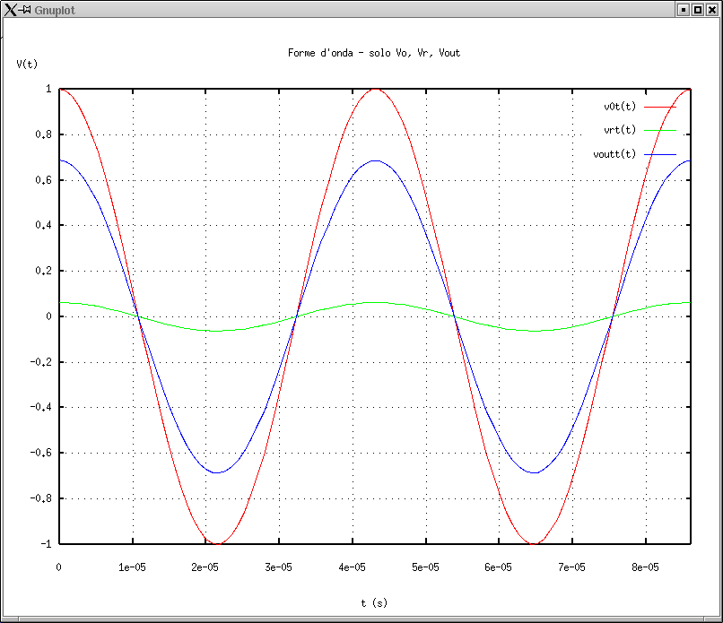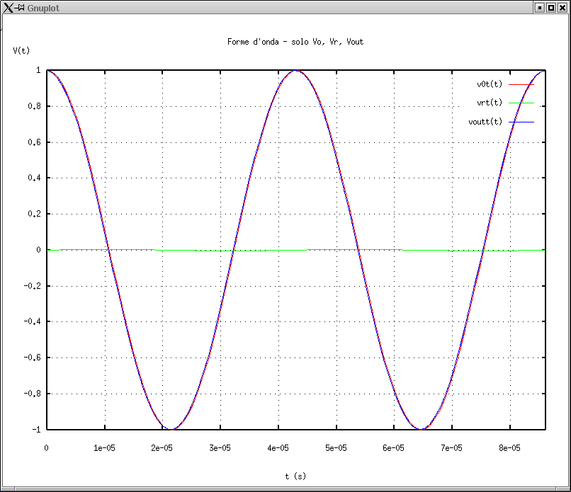 8. V0, Vout e VR in funzione del tempo alla frequenza di risonanza: nu = nu0. |