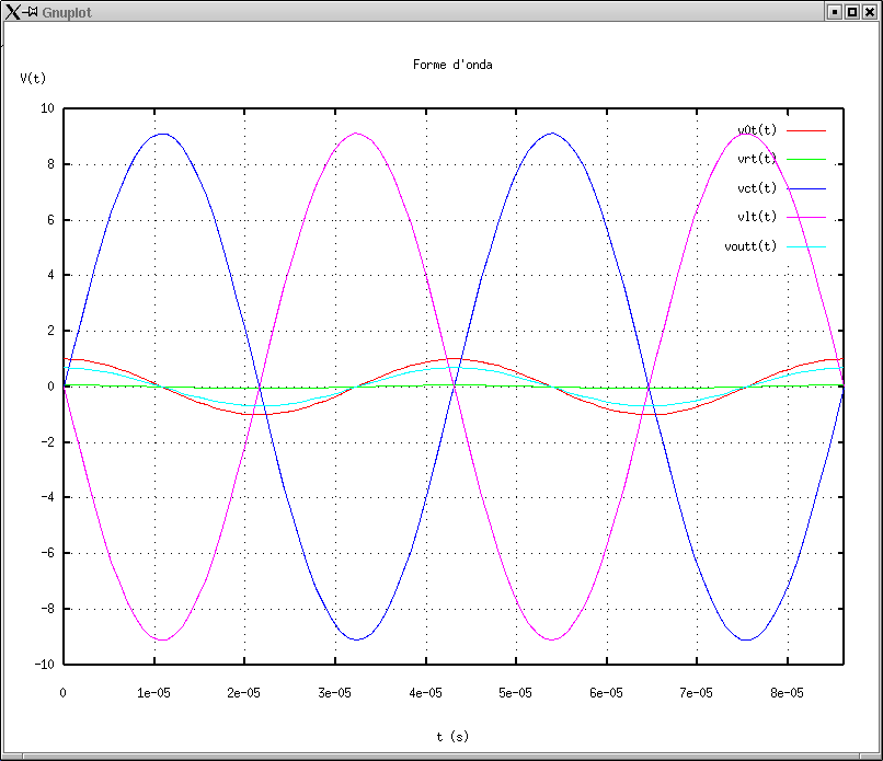 7. Tensioni in funzione del tempo alla frequenza di risonanza: nu = nu0. |