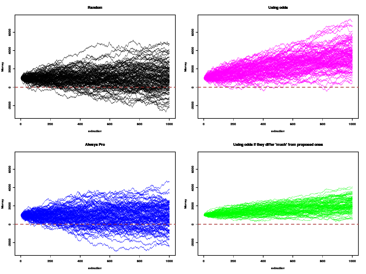 for(i in 1:50) {if(i>1) par(new=TRUE); plot( cumsum(rbinom(1000,1,0.5)-1/2 ), ty='l', ylim=c(-50,50), col='blue')}